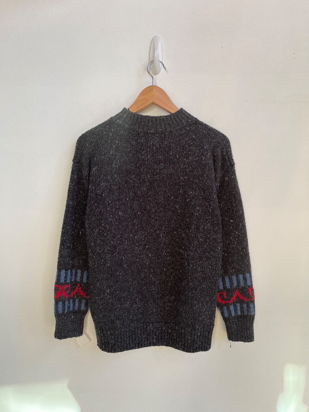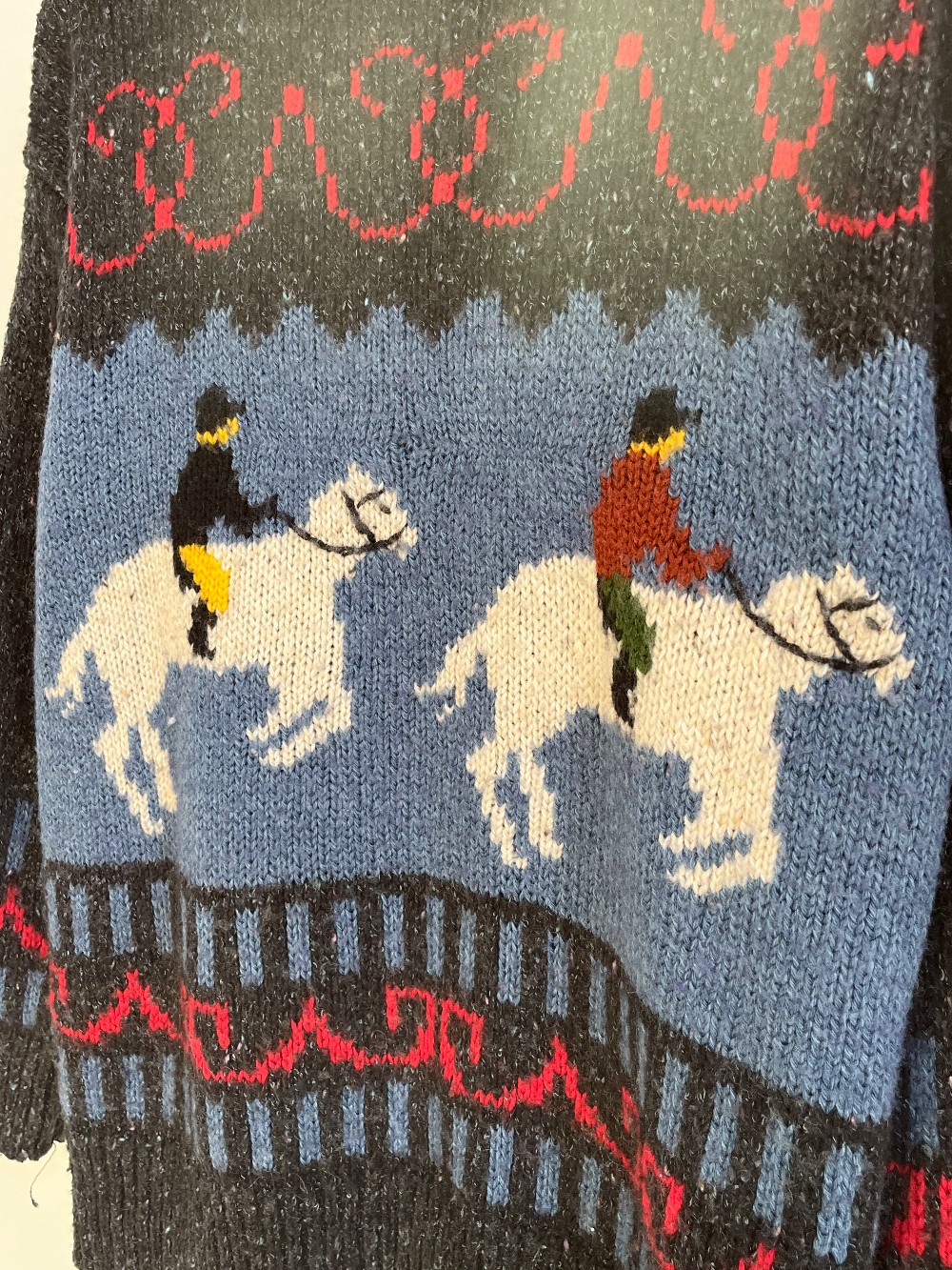 Fits oversized! An amazing vintage knit sweater with racing jockeys on front and patterns throughout. Knit is 100% wool- stretchy and soft