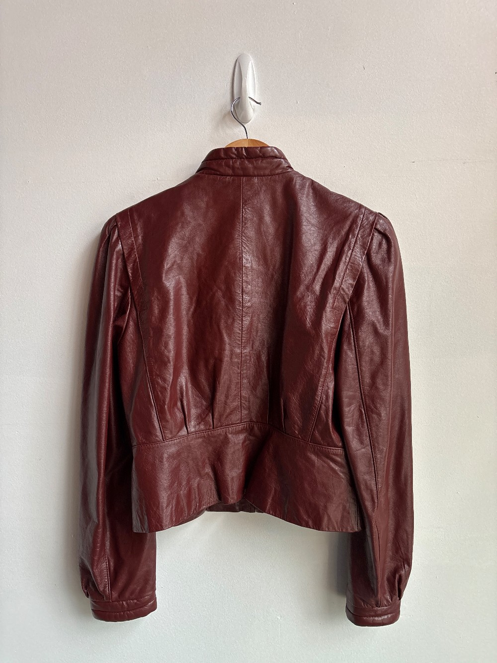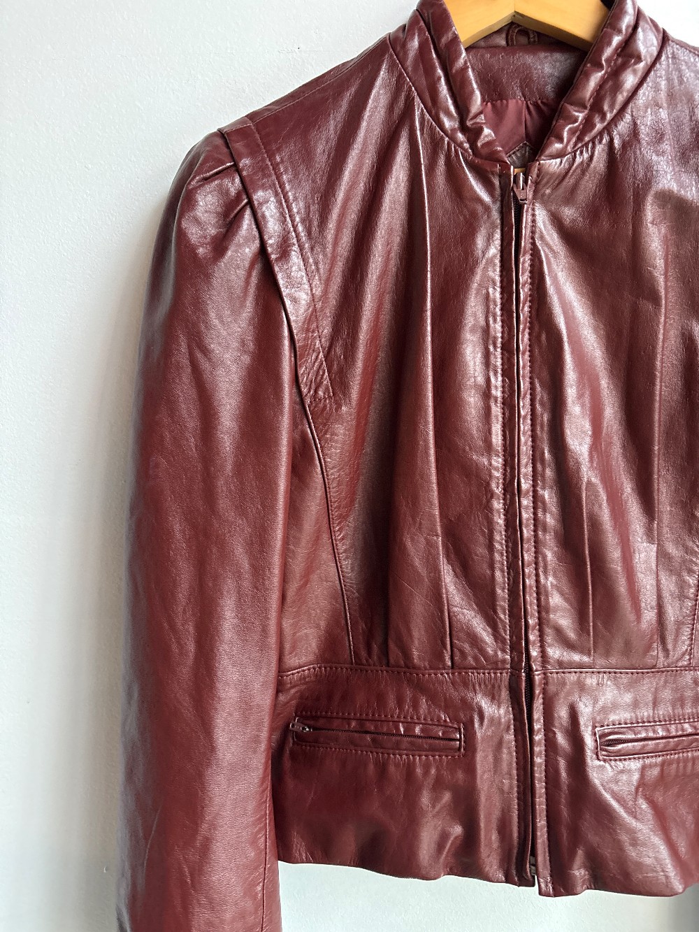 Size 10 but would fit a small best. Made in Korea! A gorgeous vintage jacket in cherry red, inside and out! Has a zip front, high neck, inner lining, tapered in waist, small zip pockets and puffed shoulder. Outer is genuine leather, in great condition
