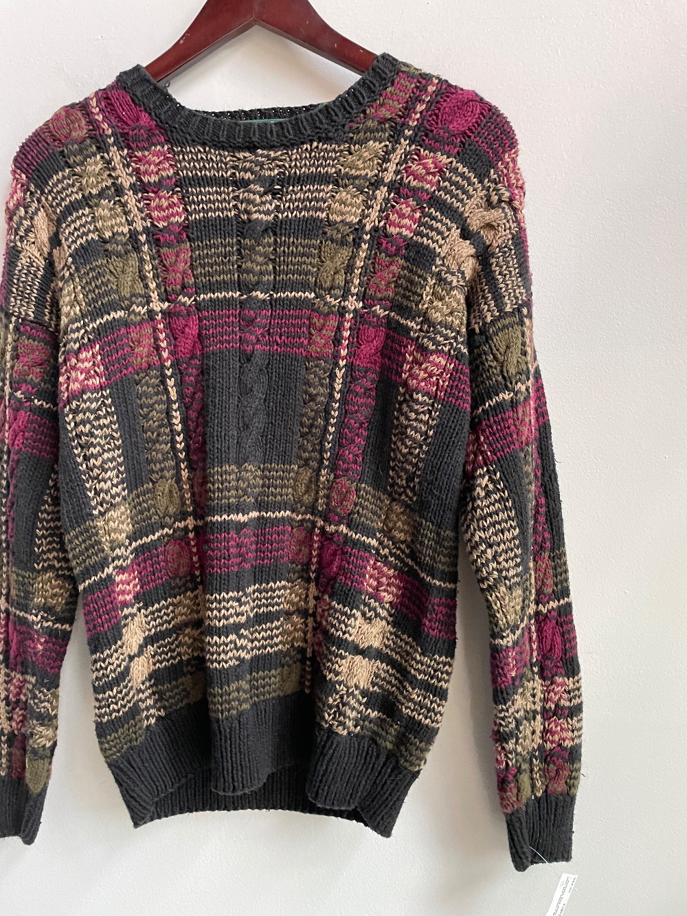 A thick knit sweater with black and burgundy plaid print all over. Made from a ramie/ cotton knit blend.