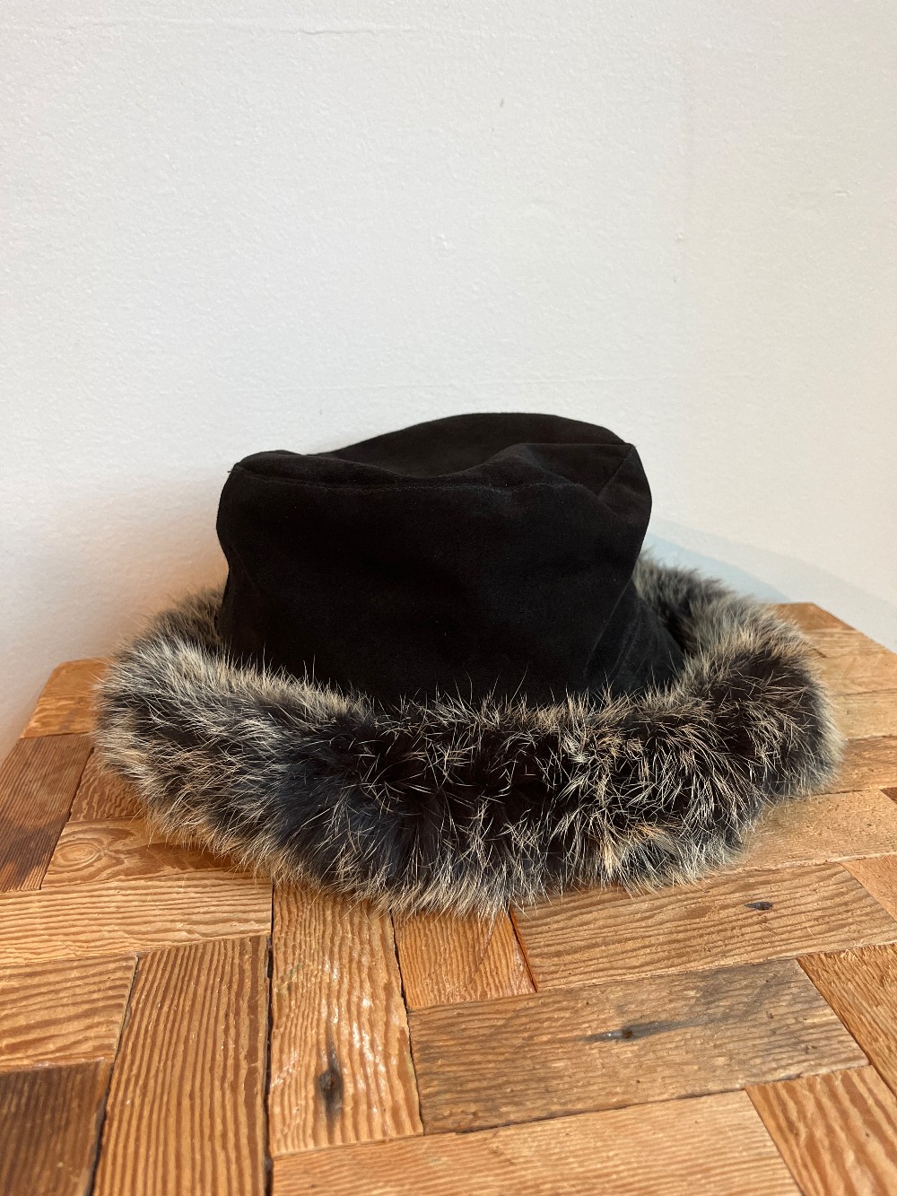 Classy 1990s Vintage DANIER Fur Trimmed Black Suede Leather Bucket Winter Hat to wear with your casual or more dressy outfits through fall and winter seasons.