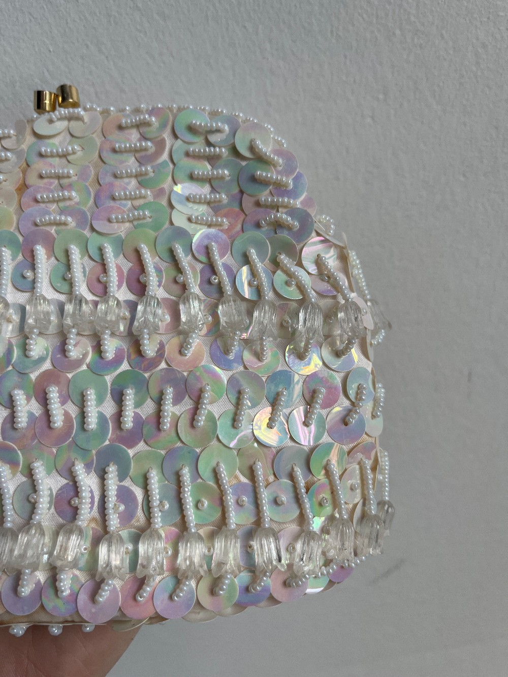 AS IS: markings on the inner lining. Handmade in Hong Kong, vintage! A beautiful opalescent sequin bag with adorning small faux pearl beads and clear rose like beads. Features a kiss clasp with golden hardwear.