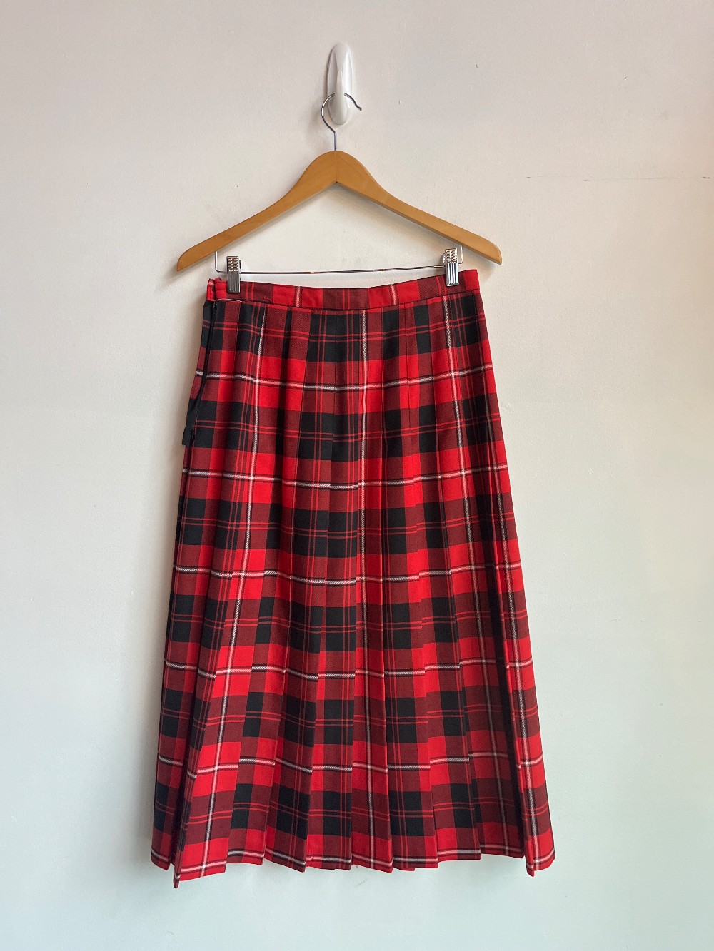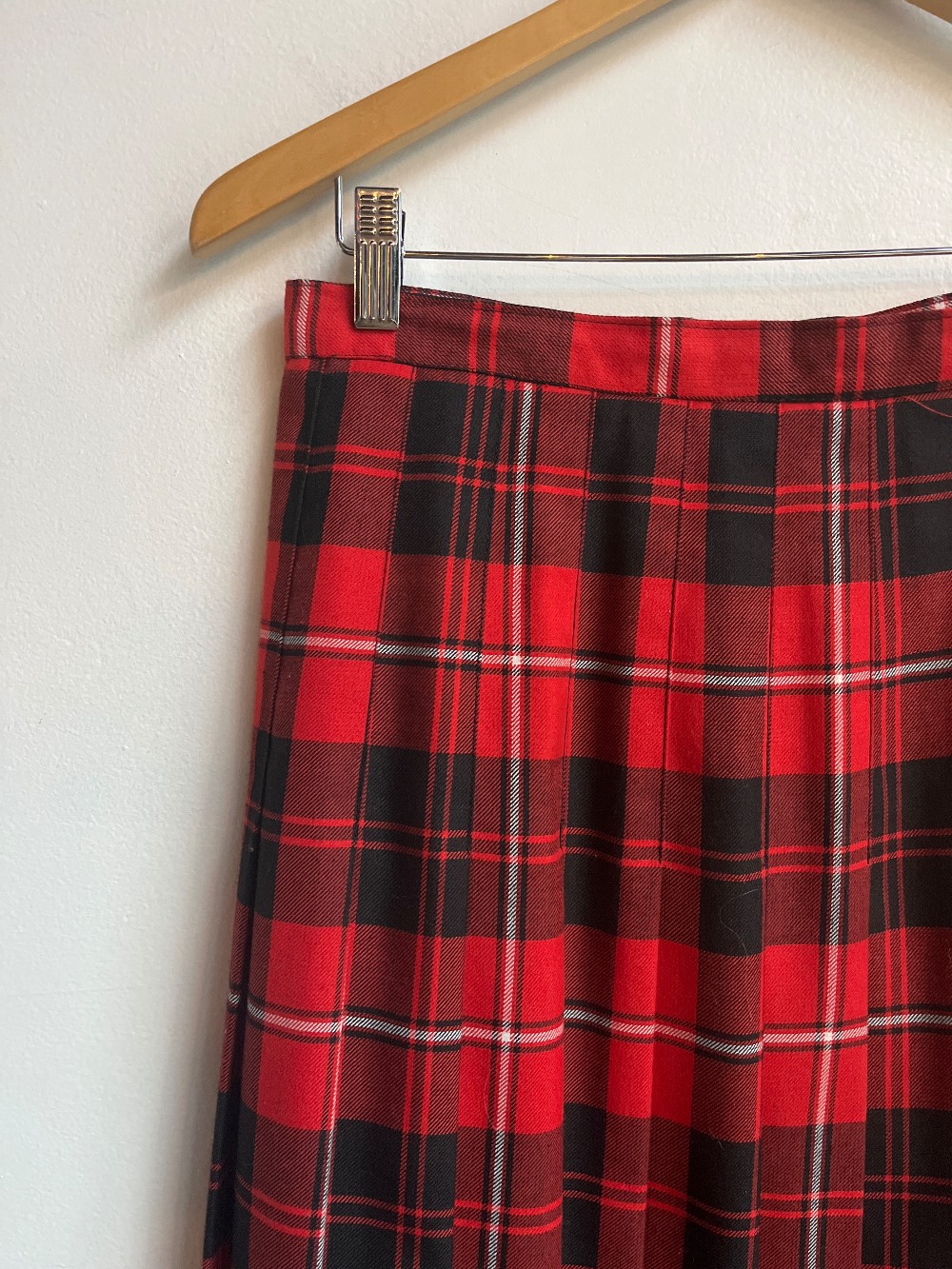 Measured approx 15” for the waist laid flat. A cotton tartan skirt with a black, red, and hinted white plaid print. Features a zip down hip and a maxi length.